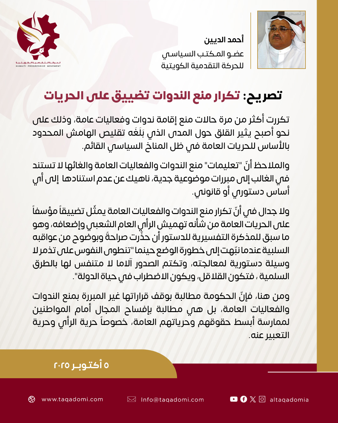 يوماً بعد يوم تثبت الحكومة ضيقها بممارسة المواطنين الكويتيين لحرياتهم العامة وحقوقهم الديمقراطية المنصوص عليها في الدستور، ومن بينها حرية تأسيس مؤسسات المجتمع المدني.فقد تلقينا بأسف خبر مماطلة وزارة الشؤون الاجتماعية والعمل في البت بطلب إشهار "الجمعية الليبرالية الكويتية" الذي تم استيفاء شروطه جميعاً، بما في ذلك الشروط التعجيزية المنصوص عليها في القانون 24 لسنة 1962، بل لقد سبق أن جرى الإعلان عن الموافقة مبدئياً على طلب الإشهار.ونحن في التيار التقدمي الكويتي إذ نعبّر عن تضامننا مع مقدمي الطلب لتمكينهم من ممارسة حقوقهم الدستورية، فإننا نكرر التأكيد بأن الكويت اليوم أحوج ما تكون إلى انفراج سياسي وإطلاق الحريات العامة للمواطنين وتوسيع دائرة المشاركة الشعبية وإلغاء كل ما يتعارض مع ذلك، فهذه هي أبسط متطلبات بناء الدولة المدنية الديمقراطية وتعزيز المواطنة الدستورية المتساوية وتقوية الجبهة الداخلية لمواجهة أي ضغوط تتعرض لها الكويت في ظل الوضع الإقليمي المضطرب.الكويت في ٢٩ سبتمبر ٢٠١٧